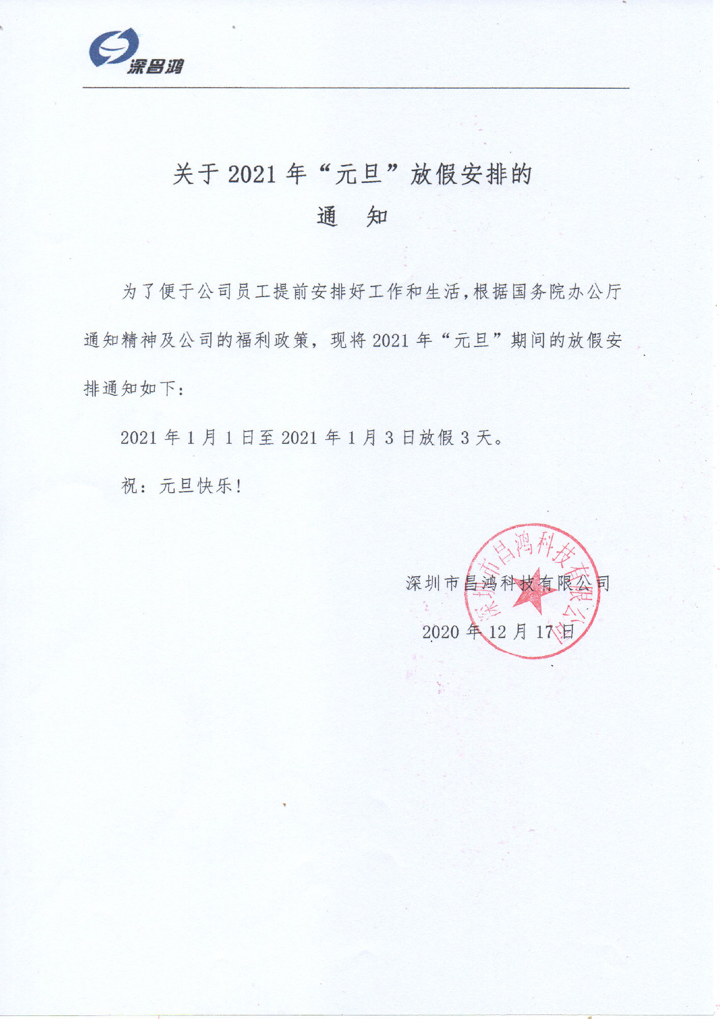 為了便于公司員工提前安排好工作和生活,根據(jù)國務(wù)院辦公廳通知精神及公司的福利政策,現(xiàn)將2021年“元旦”期間的放假安排通知如下: