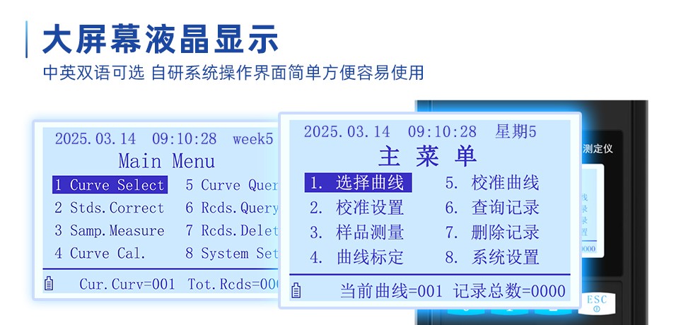 ●  可保存標準曲線50條及500個測定值(含帶時間標簽年、月、日、時、分、秒的測量值、吸光值及透光率)